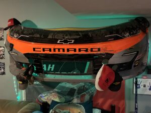Have a rear quarter panel from Carson Hocevar’s #42 truck that we got autographed by Carson and the designer of the scheme on the truck.