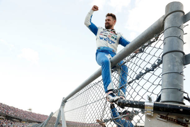 Ricky Stenhouse Jr. sat atop the pylon (and fence) after his Playoff Talladega win. Photo by Sean Gardner — Getty Images